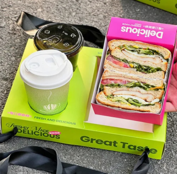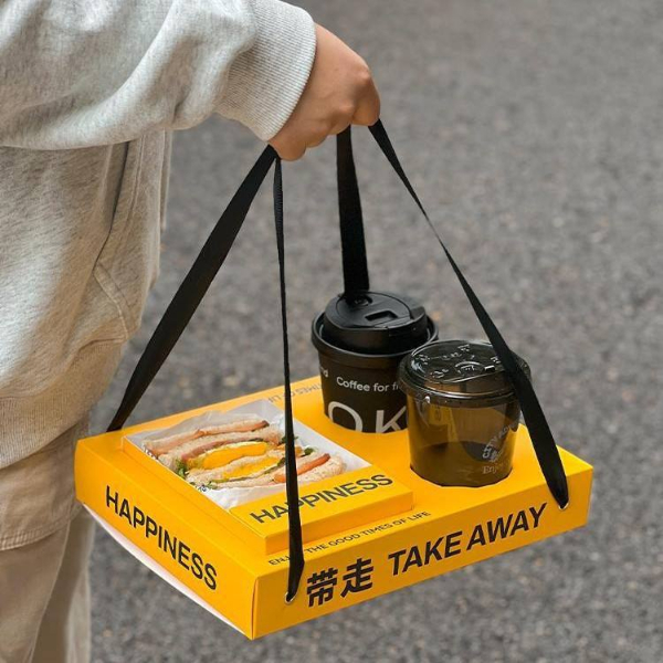 Customized Sandwich Cake Toast Cafe Beverage Cup Embedded Hand-Held Paper Tray Box for Coffee Shop